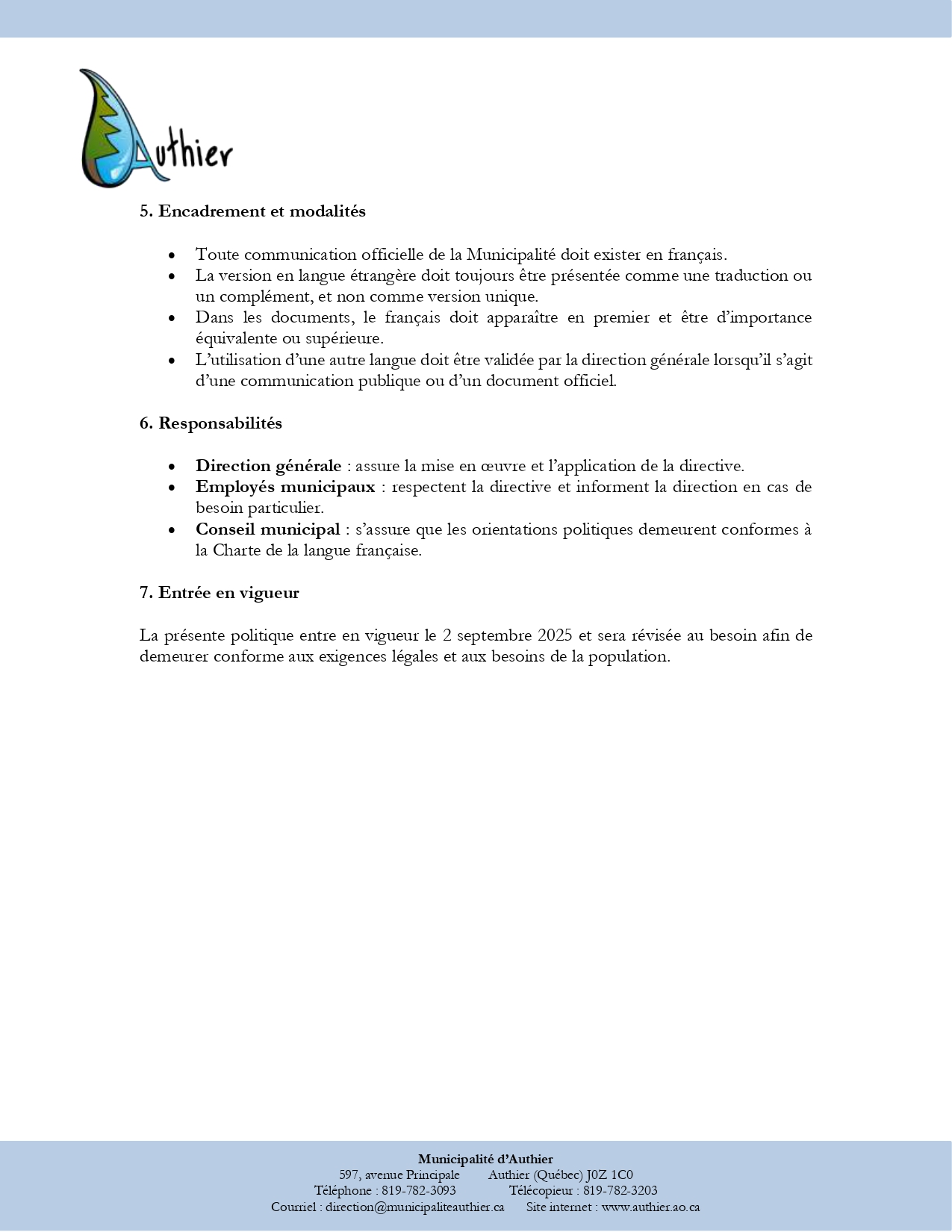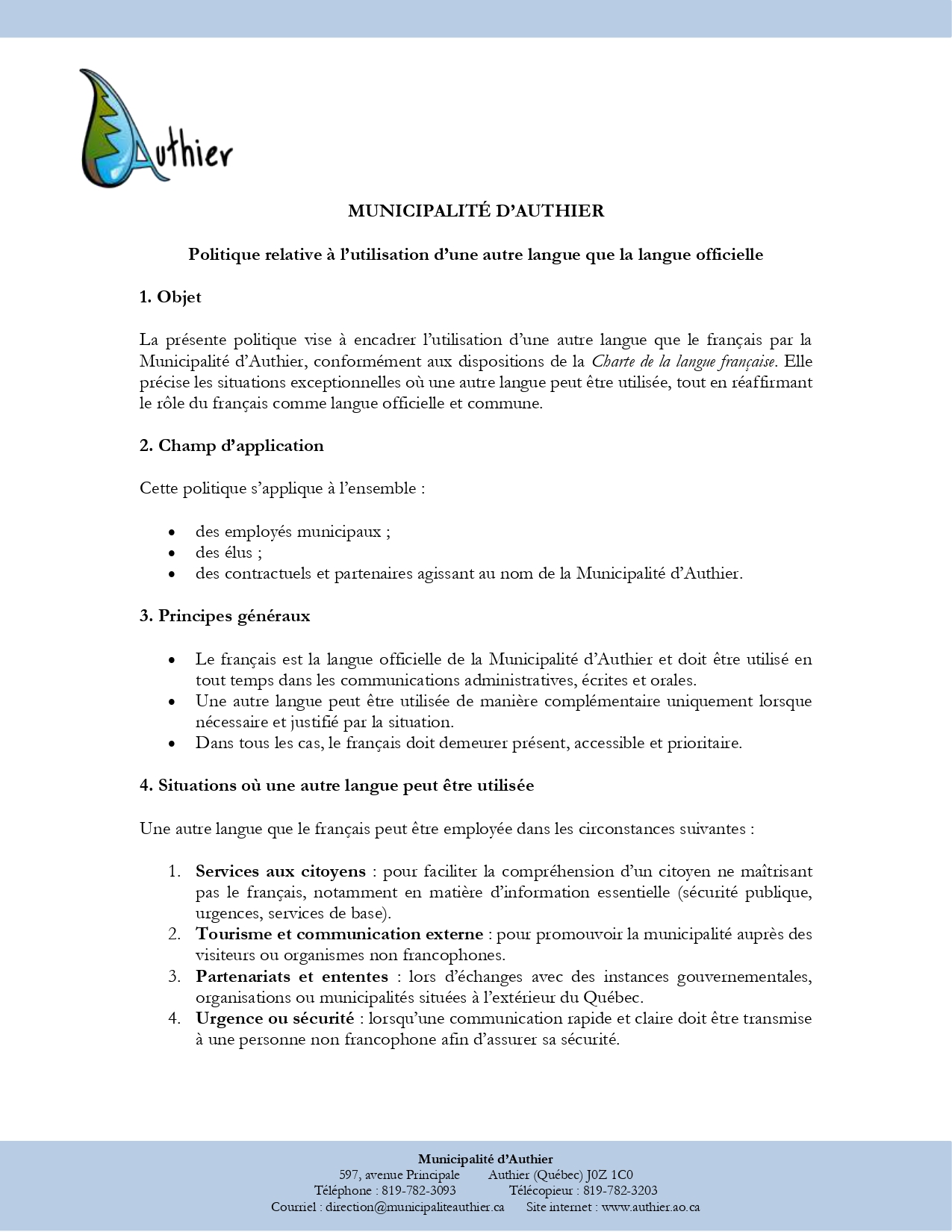 La Municipalité d’Authier utilise le français comme langue officielle dans toutes ses communications. Une autre langue peut être utilisée seulement dans des situations exceptionnelles : pour aider un citoyen non francophone, pour le tourisme, pour des partenariats externes ou pour des raisons de sécurité. Le français doit toujours rester la langue prioritaire et apparaître en premier dans tous les documents officiels.