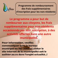 Un montant global de $1,000.00 sera autorisé par année par la municipalité d’Authier pour le programme « Programme de remboursement des frais d'inscription supplémentaires pour les non-résidents». Il est à noter, qu’une fois le montant total du budget annuel alloué à ce programme sera atteint, la municipalité d’Authier n’accordera plus de remboursement, donc premier arrivé, premier compensé...!